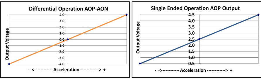 當SDI 2240和2480型MEMS直流加速度計通過AOP和AON輸出信號以差分配置接入儀器時可提供優異性能,同時亦支持單端模式以增加使用的靈活性。這些加速度計產生隨加速度改變的差分模擬輸出電壓對(AON和AOP),其信號圍繞大約2.5伏特的共模電壓變動。在零加速度情況下,差分輸出電壓接近0伏特;而在滿量程加速度下,則分別為±4伏特。值得注意的是,這種輸出比例因子不受8至32伏特供電電壓的影響。如果無法實施差分連接,建議采用單端模式,即僅將AOP與GND連接至儀器并斷開AON,但需注意這種方式會使得信噪比降至差分連接的一半。
