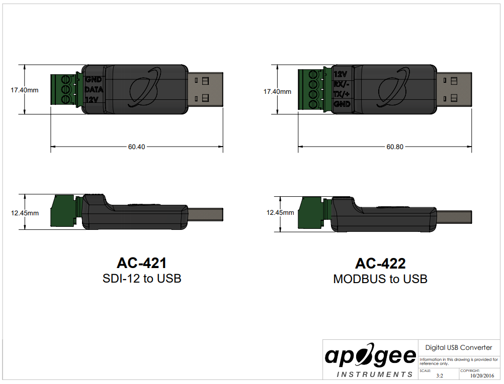 AC-421的一側有一個USB接口,可以插到電腦上。AC-421的另一側有+ 12v out, GND和SDI-12數據通道,用于連接任何標準SDI-12傳感器(為了正確操作,請先連接地線)。