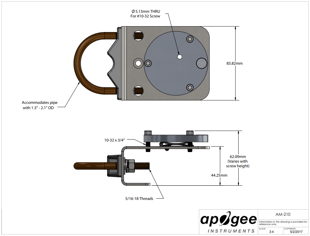 AL-120 安裝支架: 帶水平板的 AL-120 太陽能安裝支架設計用于將 Apogee Instruments 的總輻射表、總輻射表、量子傳感器、紅色-遠紅外傳感器、PAR-FAR 傳感器和紫外線傳感器安裝到桅桿或管道上外徑為 1.3" - 2.1"。