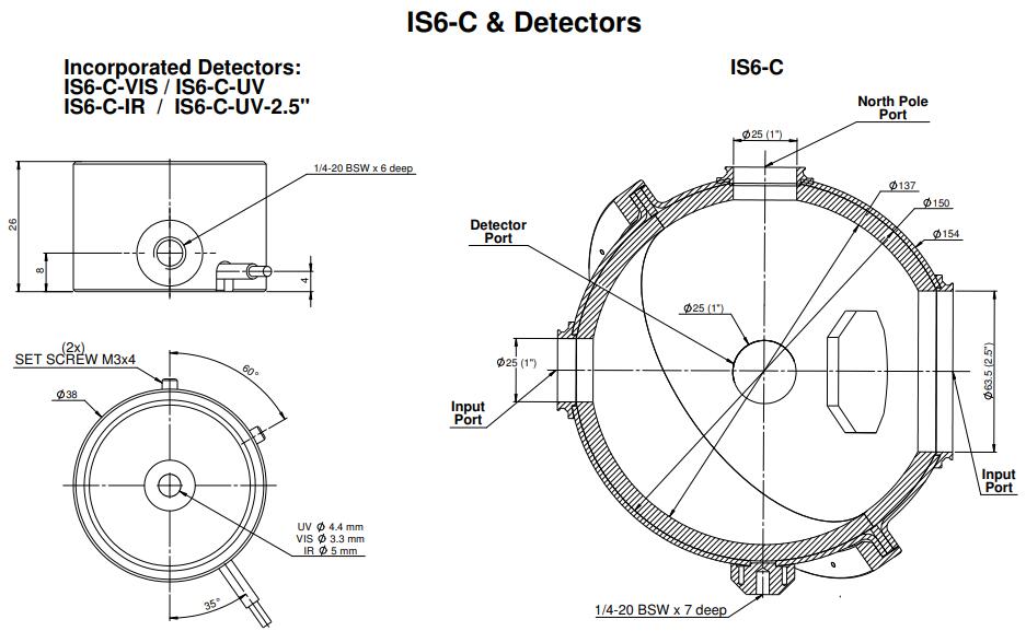 IS6-C-VIS 是一個 6 英寸積分球(內(nèi)部 5.3 英寸),帶有用于準(zhǔn)直 (C) 光束的硅探測器。IS6-C-VIS 帶有 VIS 檢測器,校準(zhǔn)范圍為 400 至 1100nm,可測量高達(dá) 30W 的功率。