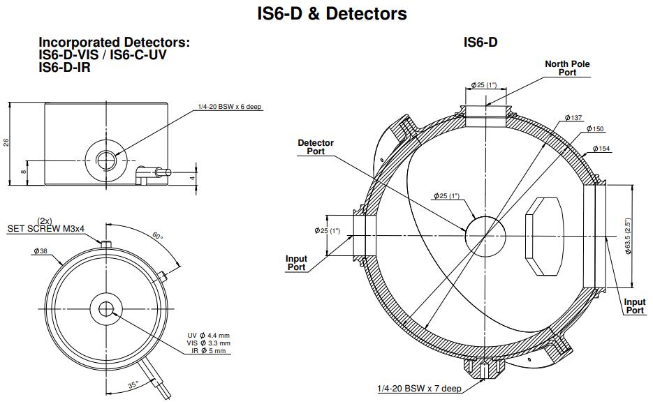 IS6-D-UV 是一個(gè) 6 英寸積分球(內(nèi)部 5.3 英寸),帶有用于發(fā)散 (D) 光束的硅探測器。IS6-D-UV 配有紫外線檢測器,校準(zhǔn)范圍為 200 至 1100nm,可測量高達(dá) 1W 的功率。