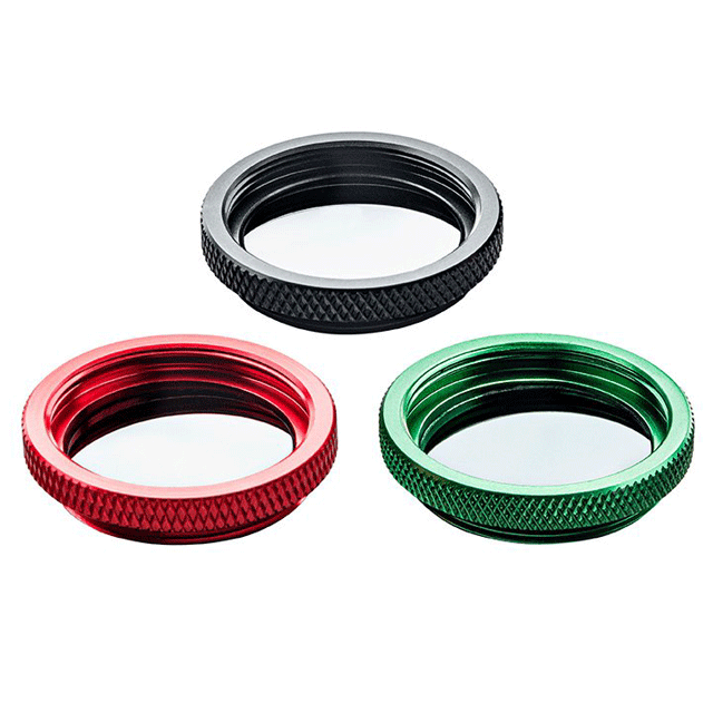 單個(gè)濾光片有三個(gè)版本,紅色外殼中的 ND1 濾光片在可見(jiàn)光中具有約 10% 的透射率,黑色外殼中的 ND2 濾光片具有約 1% 的透射率,綠色外殼中的 ND3 濾光片具有約 0.1% 的透射率。單獨(dú)的濾光片可以 用螺絲固定在彼此的頂部,因此可以堆疊,也可以與分束器結(jié)合使用。它們?cè)谕鈿ぶ性O(shè)置成較小的楔角,以免造成干擾影響。