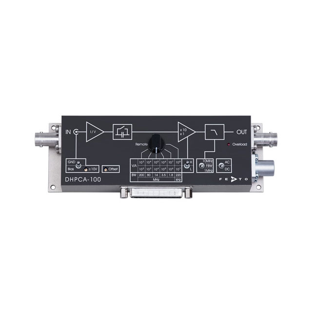The many features of the DHPCA-100 include: Adjustable gain from 10 2 to 10 8 V/A, adjustable bias and offset voltages, switchable 10 MHz and 1 MHz low-pass filters, switchable AC/DC coupling, and all important options can control functions either directly on the device or through a digital interface (e.g. using a PC). All are housed in rugged, compact, and EMC compliant housing, allowing amplification directly at the source without the need for long cables or interfering signals.