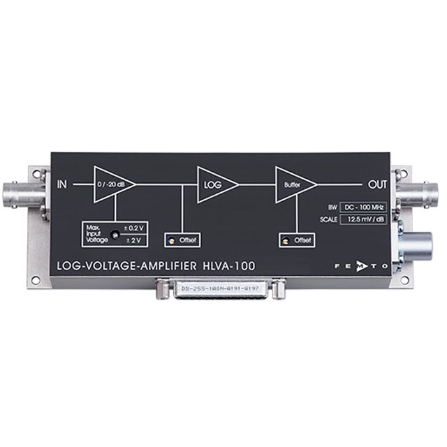 The FEMTO HLVA-100 offers a wide dynamic range of up to 80 dB. With a DC coupled input and a rise and fall time of just 5 ns the HLVA-100 is the ideal tool for the measurement of fast and high dynamic pulses. The input voltage noise is extremely low with just 2 nV/√Hz. The logarithmic gain curve offers high gain for small input signals and relatively low gain for high input signals. Therefore the HLVA-100 is the ideal amplifier for signals with high dynamic range and applications in which a signal compression is desired.