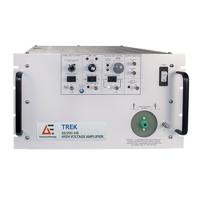 The non-inverting Trek 20/20-HS high voltage amplifier features an all-solid-state design, high slew rate, ample bandwidth, and low-noise operation. Its four-quadrant, active output stage sinks or sources the current into reactive or resistive loads throughout the output voltage range. For demanding highly capacitive or reactive loads, this type of output is essential to enable accurate output responses and high slew rates.