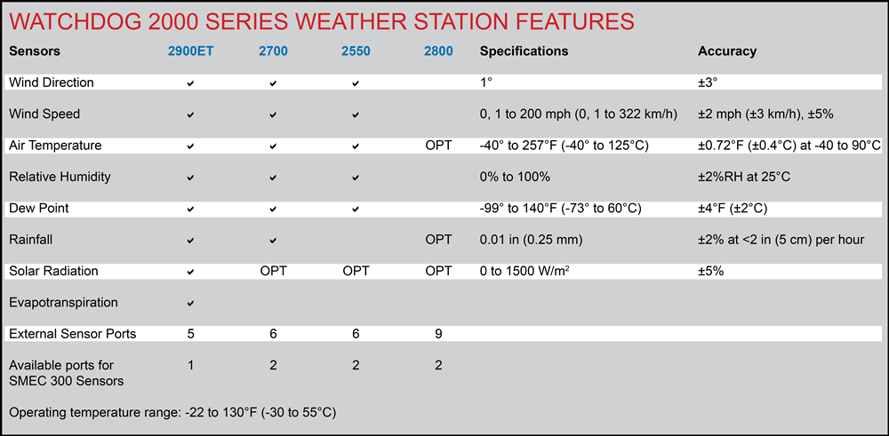 The WatchDog 2800 Station is ideal where multiple sensor measurements are required for temperature, soil moisture, crop canopy light or leaf wetness data. Customize the station to your application by choosing up to eight plug-in sensors, plus one optional rainfall sensor. The 2800 Station features the same memory, power source and LCD as other WatchDog Stations, and accepts the same communication devices and sensors. Requires SpecWare Pro software.